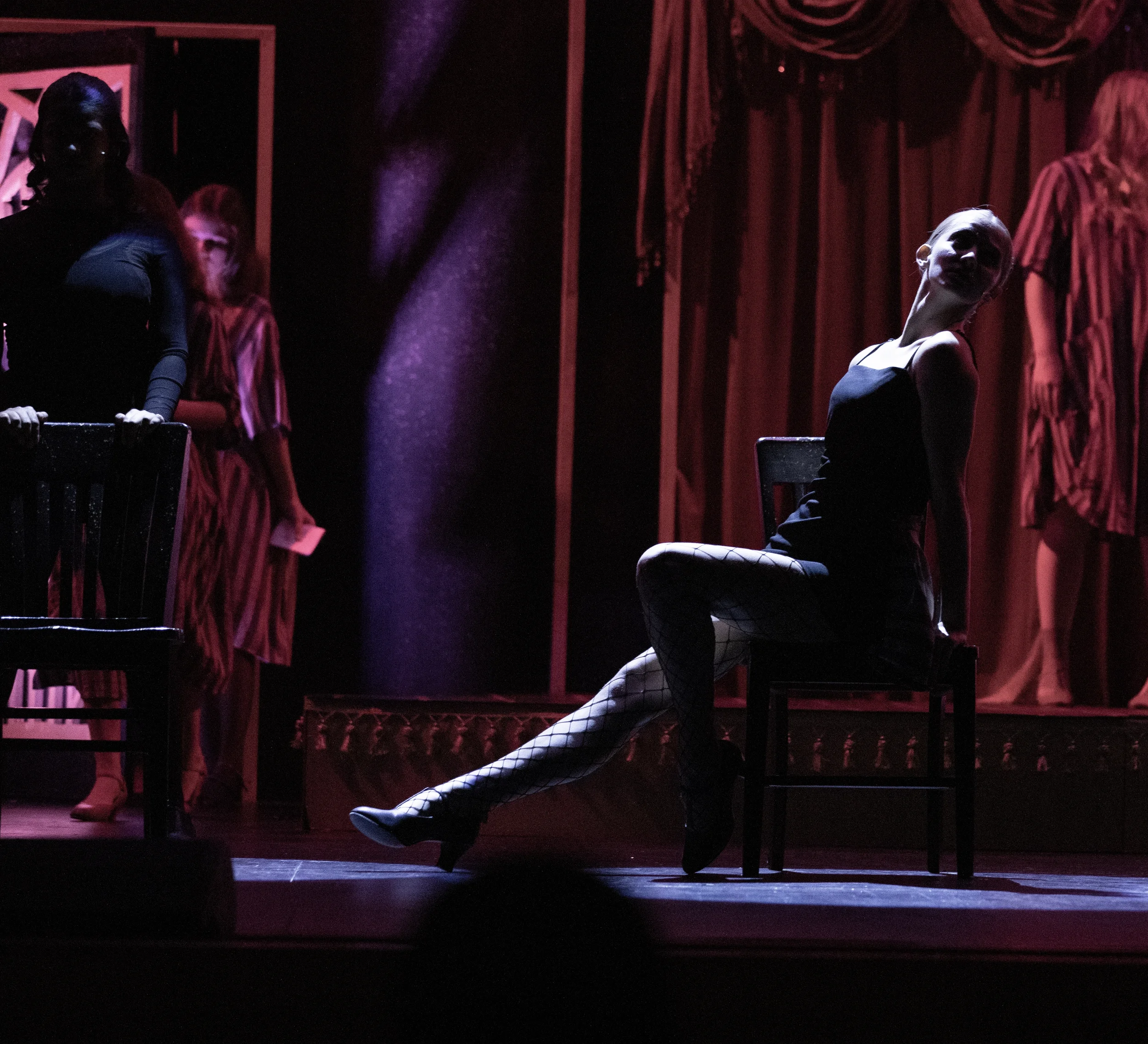 A woman is sitting on a chair on stage with her head tilted back, wearing a black dress and fishnet stockings, under stage lights with red curtains in the background.